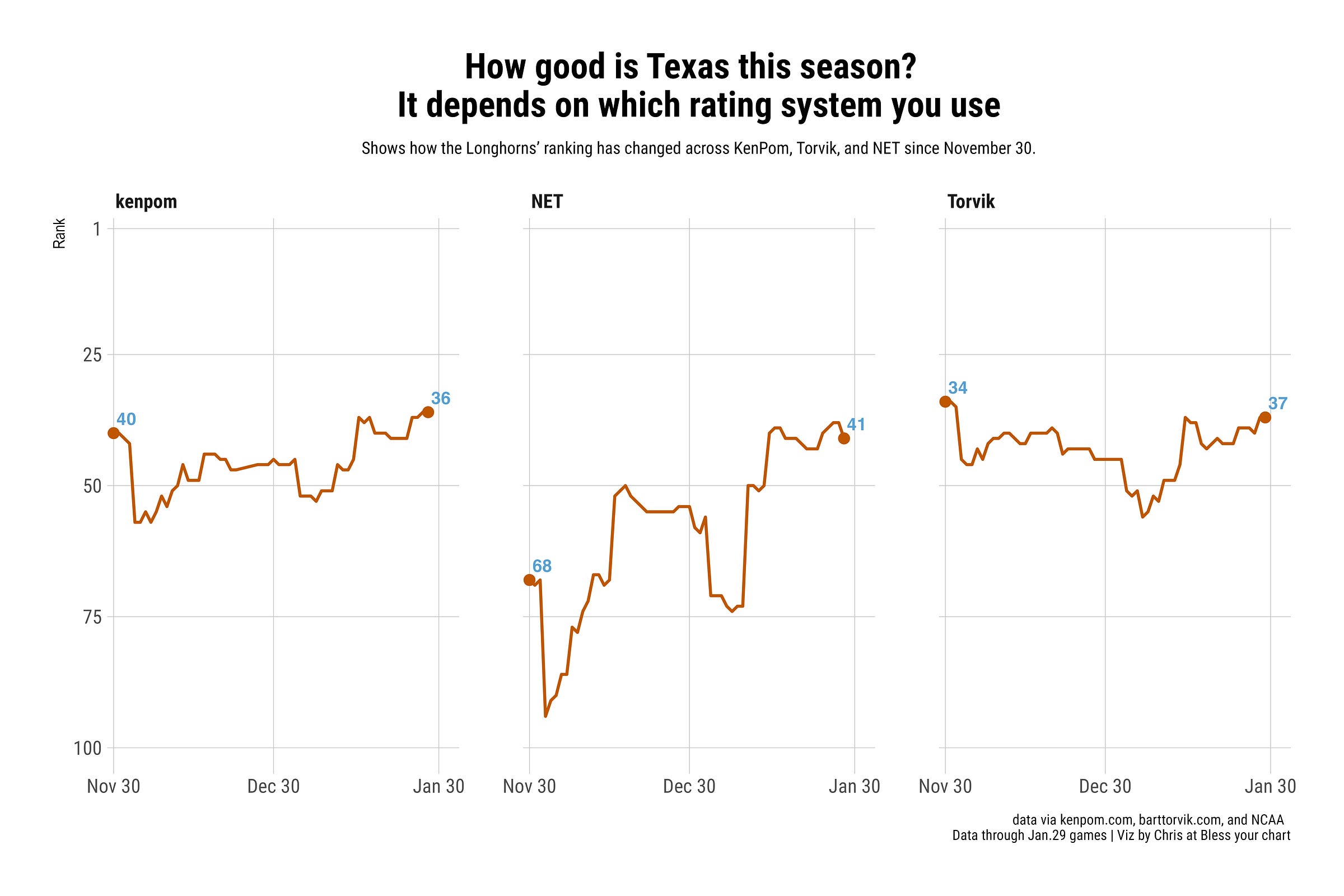 Unlike the NET, both Pomeroy and Torvik use priors or preseason ratings. Pomeroy had the Longhorns ranked 39th in the preseason, and Torvik slotted Texas at 37th ahead of the first game.