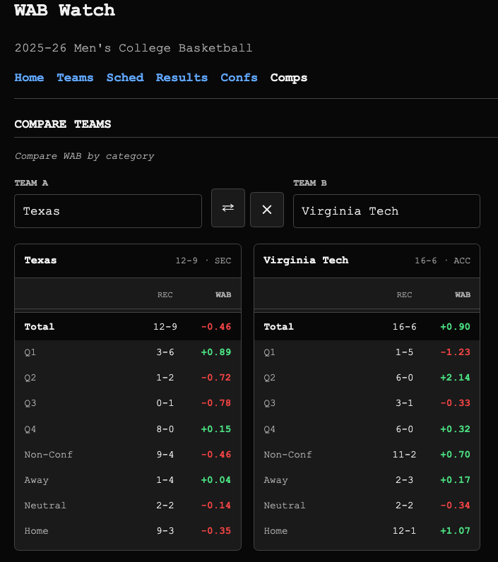 It’s not predictive, and yet, it’s still wildly useful to compare teams. You can track WAB game-by-game over at wabwatch.com and this week I’ve added a Comps page to compare two teams.