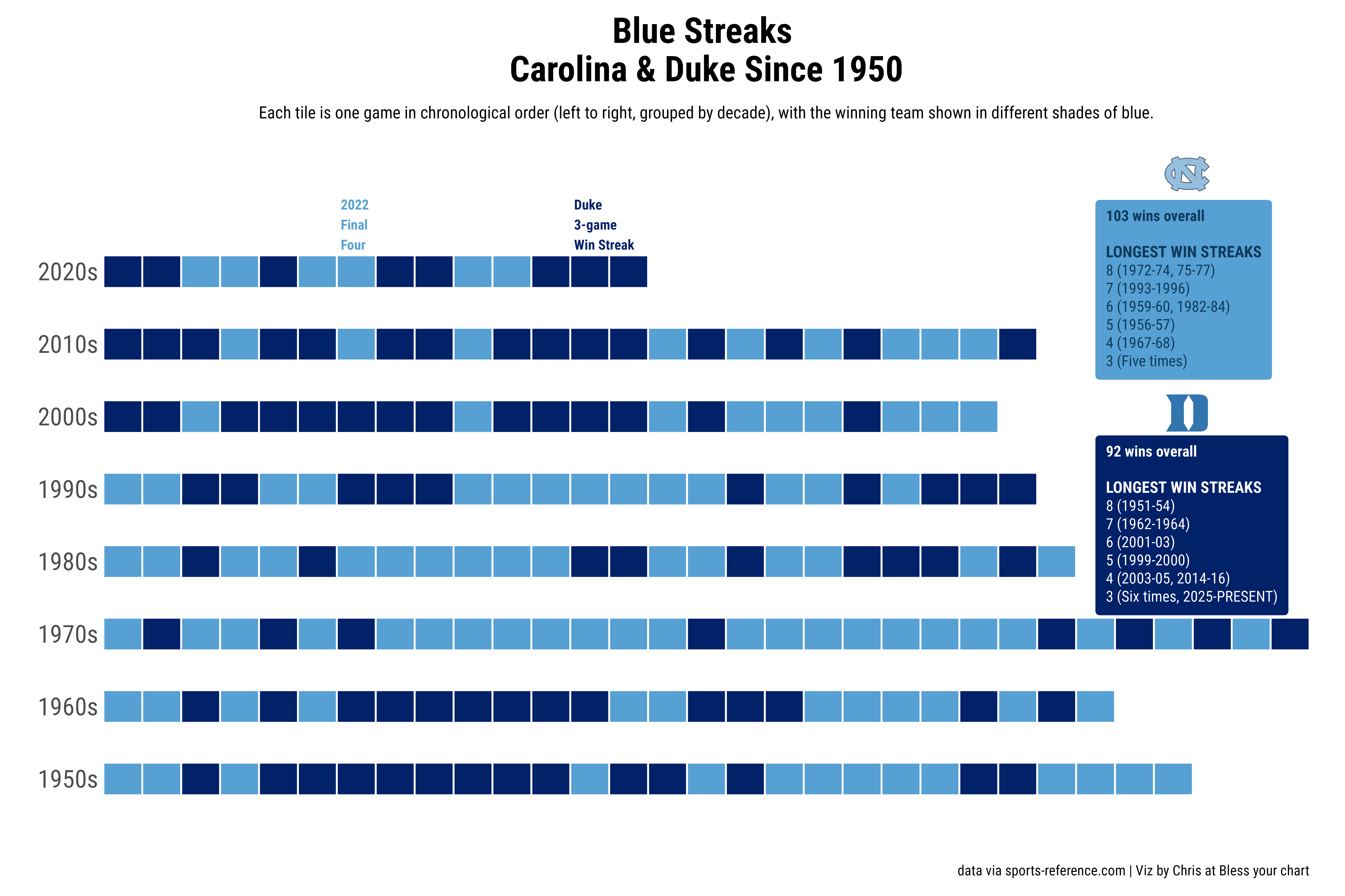 As a comparison, Carolina has registered three win streaks of exactly three games over the past 25 years. You would have to go back to the mid-1990s to find a Carolina win streak of four or more games, as the Heels won seven straight in the rivalry from 1993 to 1996.