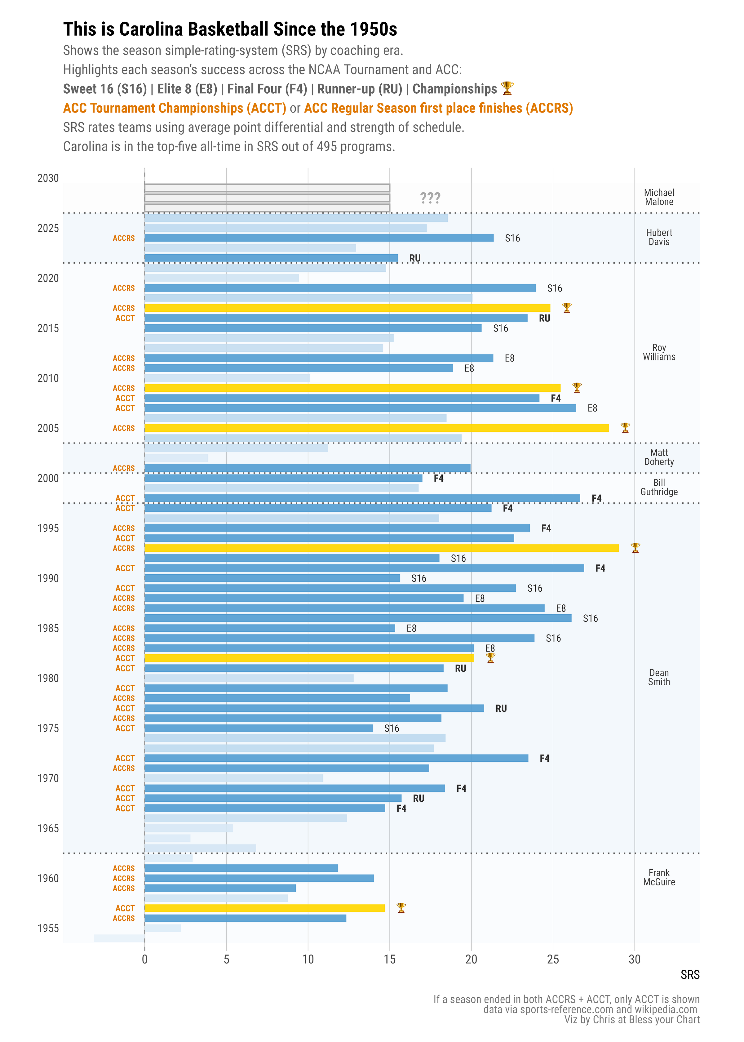 Below is a chart that shows the SRS for every Carolina basketball season since 1954 and highlights successful seasons based on NCAA Tournament results and ACC results. The bar for success matches a lot of Malone’s contract incentives: a regular-season ACC first place finish, an ACC Tournament title, advancing to the Sweet 16 or Elite Eight, making the Final Four, or winning the national title.