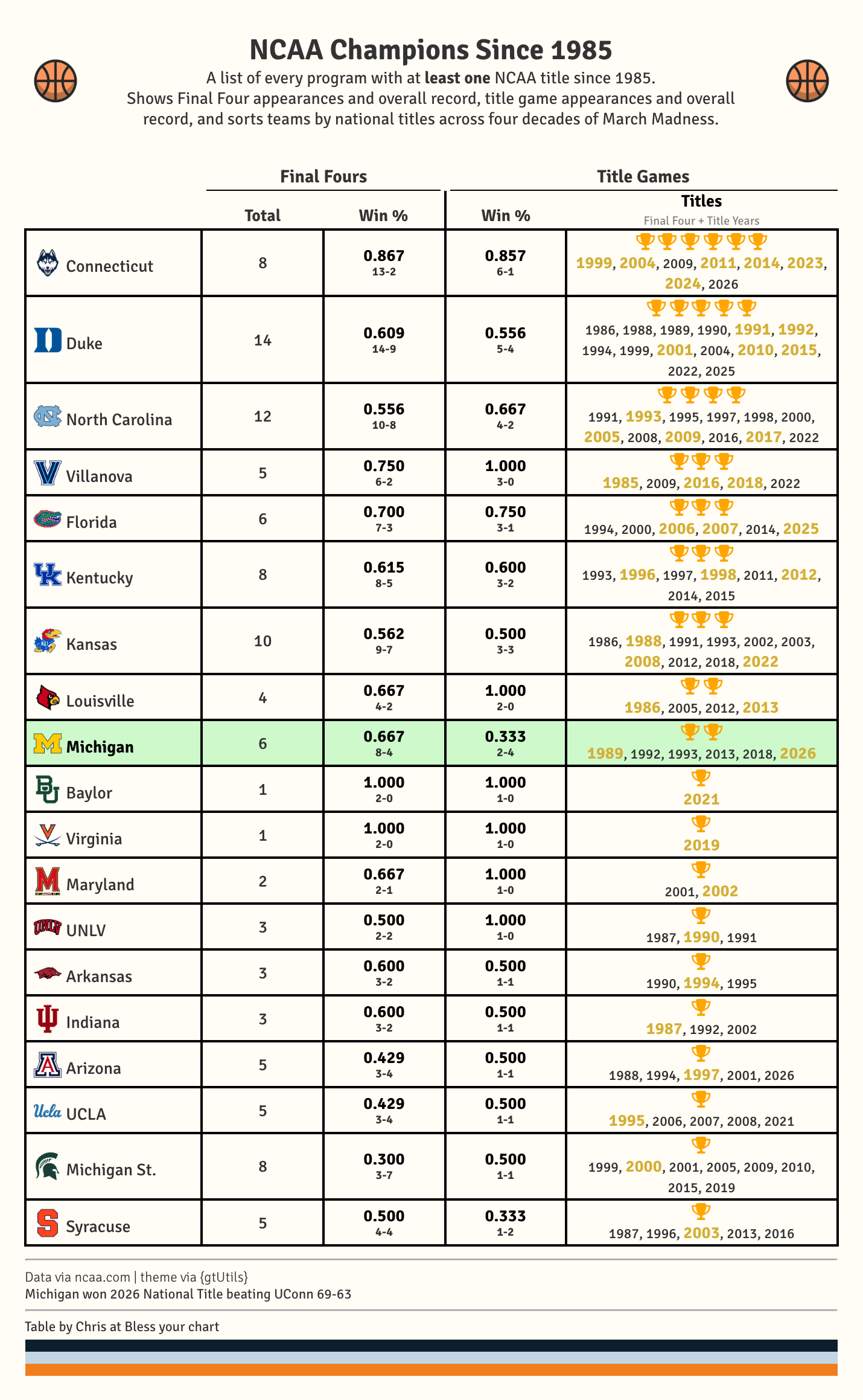No other program can match UConn’s six titles out of eight trips to the Final Four. Duke, North Carolina, and Kansas all have more Final Four appearances since 1985 and fewer NCAA Tournament absences than UConn in this span. All three blue bloods have won fewer titles than the Huskies since 1985.